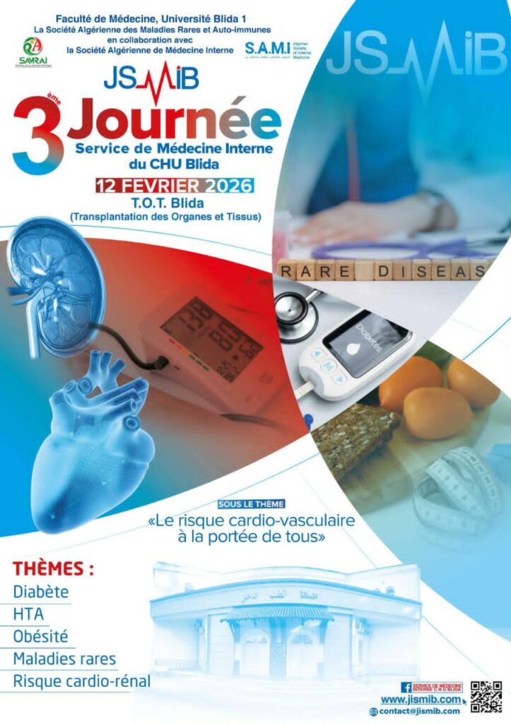 ك.د تحتضن كلية الطب بجامعة البليدة 1 اليوم الخميس، فعاليات اليوم الثالث لخدمة الطب الداخلي بالمركز الاستشفائي الجامعي “TOT” البليدة (زرع الأعضاء والأنسجة)، وذلك بالتنسيق مع الجمعية الجزائرية للأمراض النادرة وأمراض المناعة الذاتية، وبالتعاون مع الجمعية الجزائرية للطب الداخلي، تحت شعار: «الخطر القلبي الوعائي في متناول الجميع. ويأتي تنظيم هذا الموعد العلمي في سياق تزايد التحديات الصحية المرتبطة بالأمراض القلبية الوعائية، حيث يهدف إلى فتح فضاء للنقاش العلمي وتبادل الخبرات بين أطباء ومختصين من مختلف التخصصات. كما يسعى إلى تسليط الضوء على أبرز عوامل الخطر التي تهدد صحة المواطن، وفي مقدمتها داء السكري، وارتفاع ضغط الدم، والسمنة، إضافة إلى الأمراض النادرة والمخاطر القلبية الكلوية. وفي هذا الإطار، يشكل اللقاء فرصة لتعزيز التنسيق بين مختلف الفاعلين في القطاع الصحي، لاسيما في مجال التشخيص المبكر وتحسين سبل التكفل الطبي بالمرضى. إذ أن رفع مستوى الوعي الصحي، خاصة فيما يتعلق بالأمراض النادرة، أصبح ضرورة ملحّة في ظل الارتفاع المتزايد لمعدلات الإصابة بالأمراض المزمنة. ومن المنتظر أن يعرف هذا الحدث مشاركة واسعة للأطباء والمختصين والمهنيين في قطاع الصحة، وهو ما يعكس الأهمية المتنامية لمثل هذه التظاهرات العلمية في دعم البحث الطبي وتطوير الممارسة الصحية، فضلاً عن ترسيخ ثقافة الوقاية باعتبارها خط الدفاع الأول لحماية صحة المجتمع